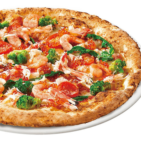 トマト・紅ズワイガニ・海老・いくら・ブロッコリー・ルーコラ・マッシュポテト・アンチョビ・ニンニク・スモークチーズ・モッツァレラ・アジアーゴ・粉チーズ ■レギュラーM 税込3,348円/L 税込3,726円 ■プレミアムM 税込3,888円/L 税込4,428円