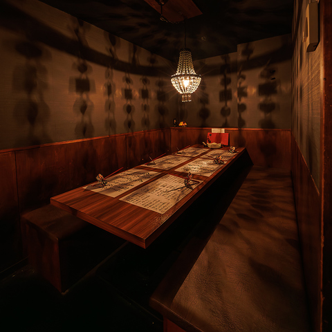 カーテンの奥にはまるで竜宮城のような特別ルームが…。いつもとは違った雰囲気で、特別な時間をお過ごしいただけます。接待や合コンなど様々なシーンにぴったり◎誰にも邪魔されることなく、心ゆくまでお楽しみください。ご利用の際にはぜひご予約を。