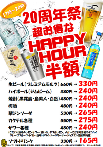 皆様に支えられ20周年!感謝を込めて17~20時は各種ドリンクが半額!お得に乾杯!!