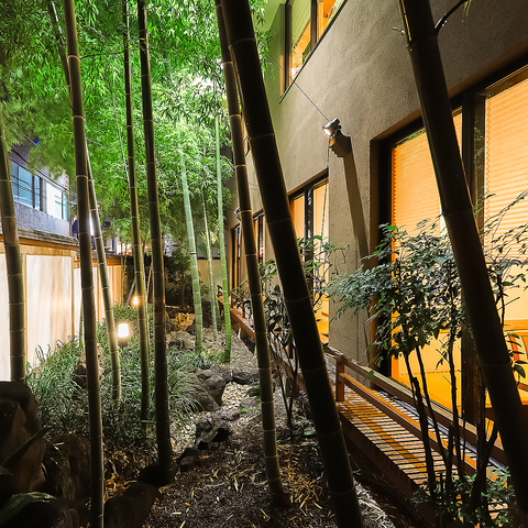 エントランスを包み込む竹林が、都会の喧騒を忘れさせる落ち着いた雰囲気を演出。四季ごとに表情を変え、昼と夜で異なる彩りを見せてくれます。心を静め、食事の時間をより特別なものに。