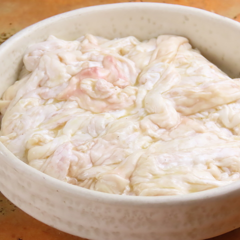 新鮮なホルモンをしおを使って洗い、流水。繰り返して、そのホルモンの脂と皮を取りながら捌いてます。しお・タレ・からみそ・にんにくの4種類があります。