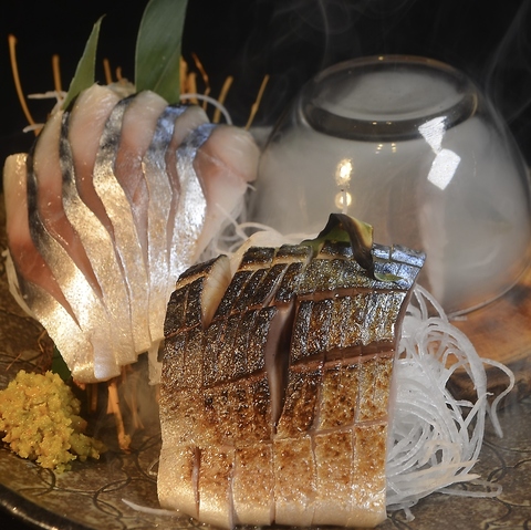 KEMURI名物「〆さば三種盛り」は、柚子・炙り・スモークの贅沢な味比べ。すべて店主仕込み、鮮度と旨みを最大限に引き出しています。