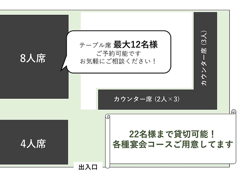 | 最大宴会収容人数 | 22人(同テーブルでの宴会は最大13名様。) |