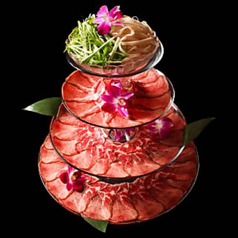 「しゃぶしゃぶ」ページの豚肉・牛タンからお好きなお肉を合計4人前以上、お野菜盛りを1人前以上ご注文くださったお客様には牛タンタワー盛りとしてお出しします。※ファーストオーダーに限ります。
