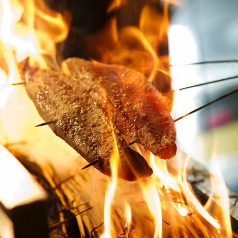 鰹のタタキは屋外で豪快に炙る、威勢のいいスタッフが織り成すパフォーマンスは必見!注文してから焼きます