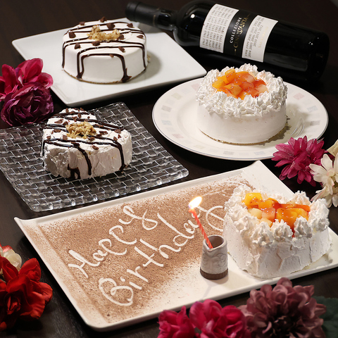 当店ではホールケーキをご用意しております!お誕生日・記念日・お祝い事やパーティーにも是非♪2360円でご用意しております。その他プレート(1500円)や花束もご用意可能ですのでお気軽にお問合せください。
