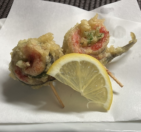 いわしは1匹分。梅肉と大葉を挟んでクルッと巻いてます。定番ではないので無い日もあります。
