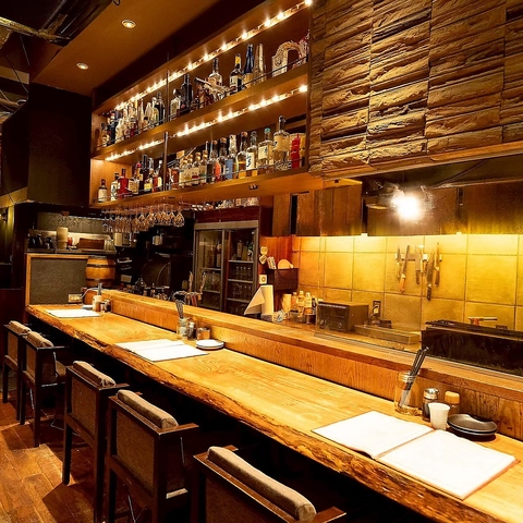【大人の隠れ家】広めのカウンターでスタッフと語らいませんか?1名様から気軽にお楽しみいただけます!!串焼きの美味しい匂いが、食欲をそそります♪お洒落な雰囲気のカウンター席は、女性のお一人様でもゆったりくつろいでいただけるお席です。また、肩を並べて座れるお席はデートにもオススメ!お気軽にご来店ください