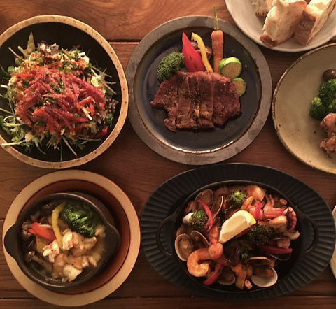 サラダ/アヒージョ/バケット/ポテトフライ/鉄板焼/パエリアと90分飲放付コース♪