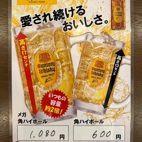 愛され続けるおいしさ!今日もサントリー角ハイボールでキメる!!メガサイズ:1,080円、通常サイズ:600円にて♪