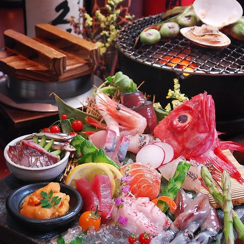 当店の名物「七輪焼き」では、美味しい魚が穫れる全国の漁港より厳選した魚介、薩摩地鶏、神戸牛など、多彩なネタをお楽しみいただけます。備長炭の火により、旨みはぐっと凝縮され、身はふんわりとジューシーに。ふつふつと湧き上がる肉汁と、こうばしく漂う香りだけでもお酒を誘う♪ 日本酒とご一緒にどうぞ。