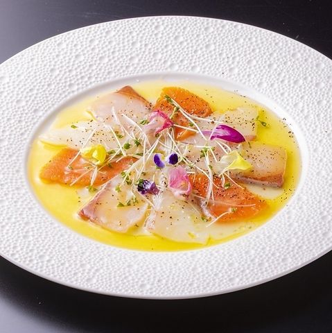 新鮮な海の幸が彩る、見た目も美しいカルパッチョ。爽やかな味わいが、食欲をそそります。
