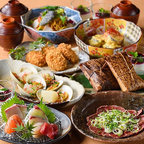宴会にイチオシのコース!鮮魚のお造り盛り合わせ、天然ジビエの炭火ハンバーグ、牛バラ肉のすき焼き風竹皮包み…等々、男女ともに大好評なメニューもずらり。飲み放題付なので、あらかじめ会費を決定しておきたい会社宴会にも便利です。