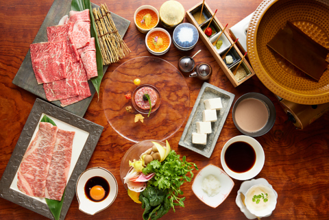 お肉は黒毛和牛の中でも各基準をクリアした最高級ブランド牛を提供します。だしは、北海道の羅臼昆布から丁寧にうま味を抽出した上品な味わいの「昆布だし」と、牛骨を贅沢に使用した独自の甘みとサラッとしてくどくないスープに仕上げた「牛骨だし」をご用意。「風雅特製のくるみだれ」は、複数の良質な素材を独自製法でブレンドしてます。