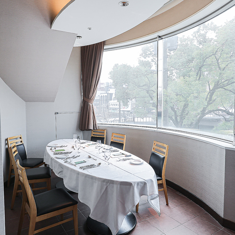 温かみのあるオーバル型のテーブル、窓からは那珂川夜景を望み、お客様の大切なひとときをより効果的にご演出