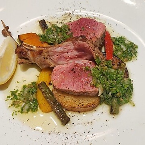 ラム肉をシンプルにグリルしました。中はほんのりピンク色で、ラム肉本来の旨味を最大限に引き出しています。パセリとケッパーの特製ソースが、さっぱりとした後味を演出し、ラム肉の美味しさを一層引き立てます。(150g 3500円(税込))
