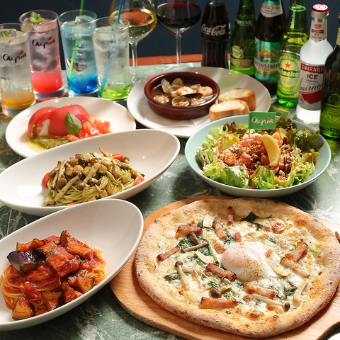 2名様でのご利用にはリーズナブルに楽しめるaquaコースがおすすめ。4名様以上のグループには、90分~150分の飲み放題付きコースが人気です。前菜・サラダ・ピザ・パスタなど定番メニューをバランスよく味わえ、女子会やデート、仲間とのお集まりにも最適。充実したひとときをお楽しみください♪