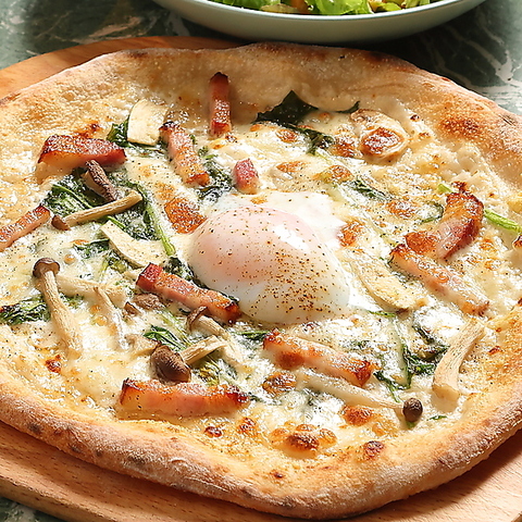 大人もこども大スキ!!(クリームソース・モッツァレラチーズ・パルメザンチーズ・パンチェッタ・ほうれん草・きのこ・半熟卵・ブラックペッパー)