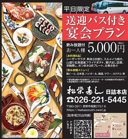 平日限定の無料送迎バス付きの飲み放題プランが登場!10名様以上でご利用可能です。リーズナブルに楽しめるチャンスです。ご友人と一緒に特別なひとときを過ごしながら、思い出に残る宴をお楽しみください。公民館や会社、駅等の往復に困りません。お得なこの機会をお見逃しなく!