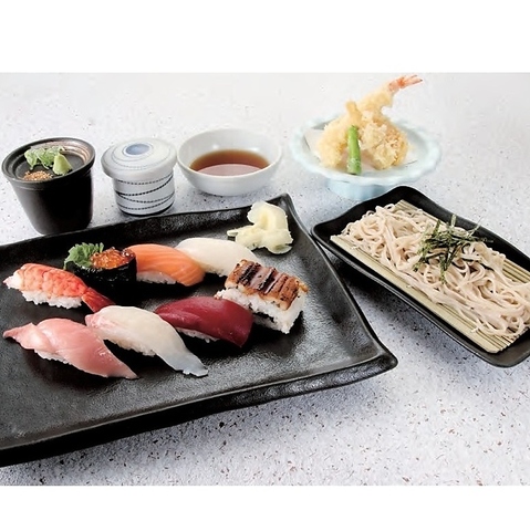 煮物、自家製モッツァレラ、サラダ、茶碗蒸し、天ぷら、更科そば、寿司