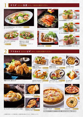 お一人様あたり2189円(税込)~[サラダor冷菜…2人前/アラカルトorピザ…2人前(アラカルト)1枚(ピザ)/オムライスorピラフ…セレブサイズ(1人前)/パスタ…セレブサイズ(1人前)/スープ&ドリンクバー付…2名様分 ※ピザは2名様向けと3名様向けが同じ量になりますのでご了承ください。●選択メニューによって追加料金が発生するものがございます。