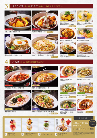 全41種から選べるセット内容:サラダor冷菜から1品/アラカルトorピザから1品/オムライスorピラフから1品/パスタから1品/スープ&ドリンクバー付●4名様以上は、組み合わせてご注文ください。●単品またはセットで付属しているドリンクバーをご注文1名様分につき、小学生未満のお子様は3名様分まで無料とさせていただきます。※キッズドリンクバーのご注文は対象外●プレミアムセットは1名様分ずつの会計は致しかねます。