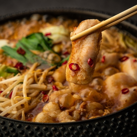 新鮮な国産牛モツと脂ののった豚トロを味噌ベースの秘伝のたれで漬け込み、野菜と一緒に煮込んだ特性汁なし鍋。