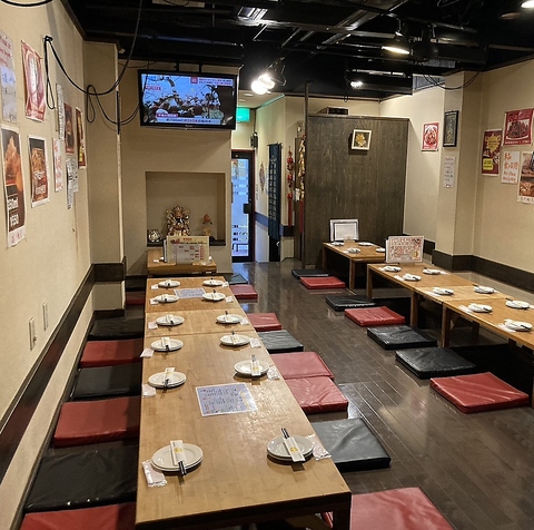 コロナ対策実施中◎空気清浄機も完備♪隣との仕切りも御座います!掘りごたつの店内は4名・8名席などのお席有。最大45名迄OK★