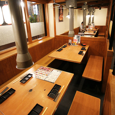 【デートや女子会に☆】余裕をもたせた席配置なので隣を気にせず、ゆっくりを食事をお楽しみ頂けます♪ロースターで煙対策もバッチリ!!みんなで炭火を囲んで盛り上がろう♪♪いろいろ選べて注文楽々の食べ飲み放題もアリ★※写真は系列店のものになります