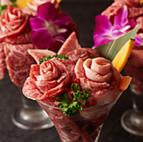 ★全コースをご予約の方限定!!★厳選された黒毛和牛肉が盛り付けられた肉の「肉パフェ」もしくは「肉ケーキ」をプレゼント♪お誕生日、記念日などにもピッタリです!焼肉屋らしいサプライズはいかがでしょうか☆各種食事会、誕生会ならぜひ「肉屋の台所 」で!