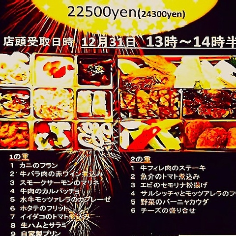 Lucciの大人気イタリアンおせちが今年も始まります☆牛フィレステーキなど豪華食材を贅沢・ふんだんに使用した特製の手作りおせちとなります♪ ご注文の受付は~12/25日までとなり、50個限定でのご提供の為、ご予約はお早めに☆(コース欄よりネット予約可能なため詳細はコース欄をチェック!)