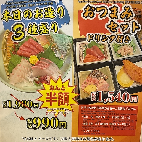 毎週月曜日、火曜日限定でお造り3種盛りか半額,おつまみセット1540円でご提供。お気軽にお問い合せ下さい。