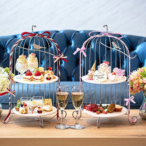 鳥かごをモチーフとしたスタンドにパティシエ特製スイーツを散りばめて可愛らしくドレスアップ