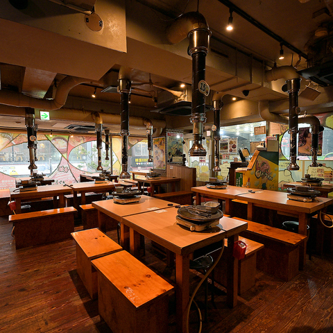 リニューアルした美しい店内には、ドラム缶の丸いテーブルを設置しました。テーブルの焼き台周辺には、脂が飛ばないようにステンレス製の油跳ねガードを設けており、快適にお食事が楽しめます。さらに、排煙ダクトも完備しているので、においも気にせず安心してご利用いただけます。