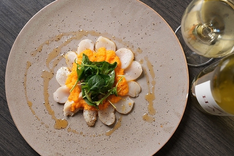 肉厚で甘みのある平貝に、雪下人参の優しい甘さを生かしたソースを合わせた上品なカルパッチョ。