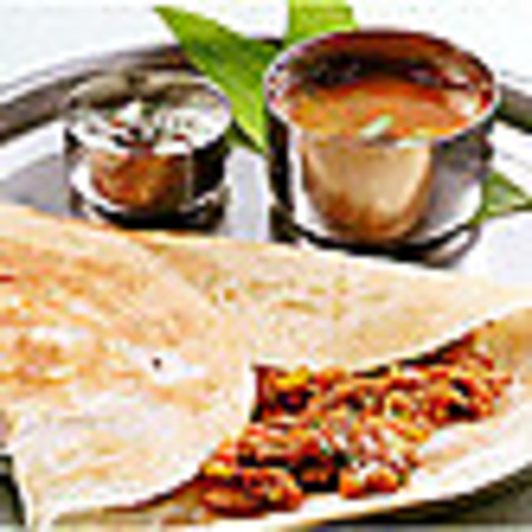 スパイスで炒めた鶏ひき肉を、米粉で作った南インドのクレープ「ドーサ」に包んだ逸品☆直径40cmはある大きなドーサに、ココナッツソースとサンバル(豆のカレーソース)をつけてお召し上がりいただきます。2種類のそれぞれのソースの味わいと共に、日本ではまだ珍しいドーサを心ゆくまでお楽しみください!