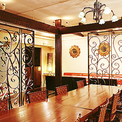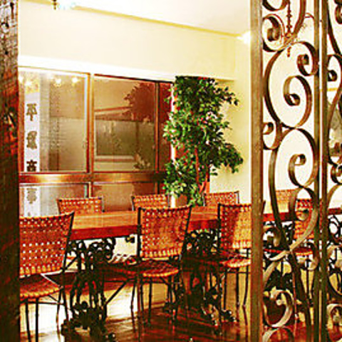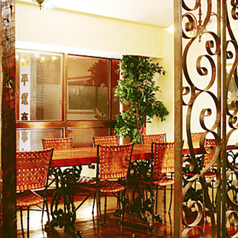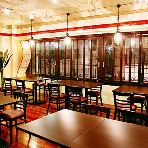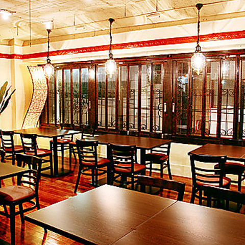 【1階席】まるで南インドの風を感じるような、異国情緒あふれる1階席。インドから取り寄せた調度品や、温かみのある照明が、お客様を非日常の世界へと誘います♪ランチやディナーでの普段使いはもちろん、お一人様でも気兼ねなくお過ごしいただけます。