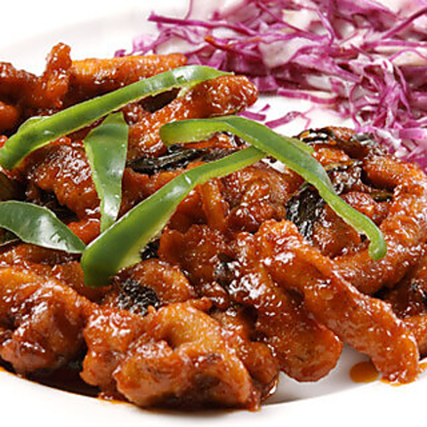 細長く切ったチキン揚げ 甘みと辛味が融合した逸品です Bangalore Chicken Flakes (Recommended) A speciality of Dakshin, julienne of chicken tossed in a sweet and spicy sauce.