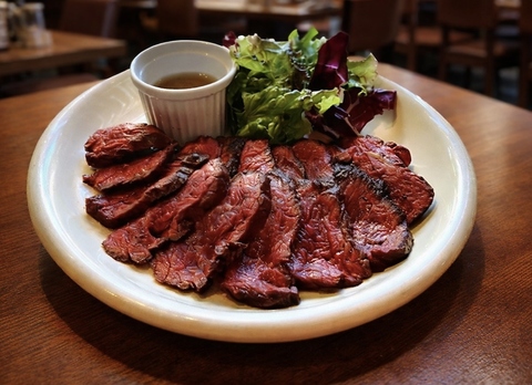 肉厚で柔らかい牛ハラミをレアに焼き上げたボリューム満点の1品!赤ワインにはやっぱりお肉が良く合います!自家製和風ソースとわさびで!肉に合う日本酒もご用意出来ます。