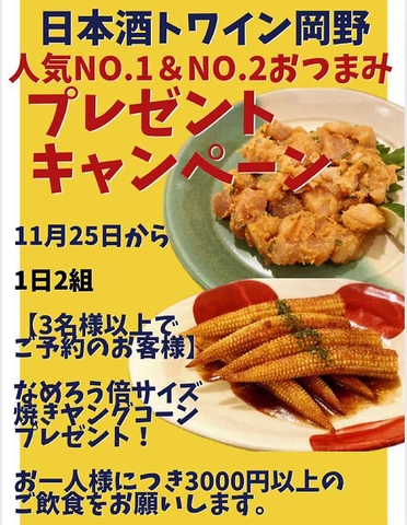 【プレゼント】岡野で人気メニューなめろう倍サイズ、焼きヤングコーンを3名様以上のご予約でプレゼント♪※お一人様につき3000円以上のご飲食をお願いします。※4名様以上のご予約はお電話下さい。