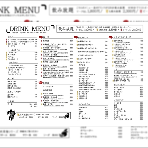 【飲み放題メニュー】 1800円(税込) / 2300円(税込)◆瓶ビール付◆ / 2800円(税込)●瓶ビール&生ビール付●