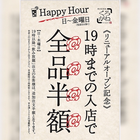 | 利用条件 | 2時間制(ラストオーダーは30分前)。グラス交換制。単品利用時の飲み放題は2フードオーダー制。別途でお通し代として450円(税込)頂いております。 |
