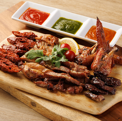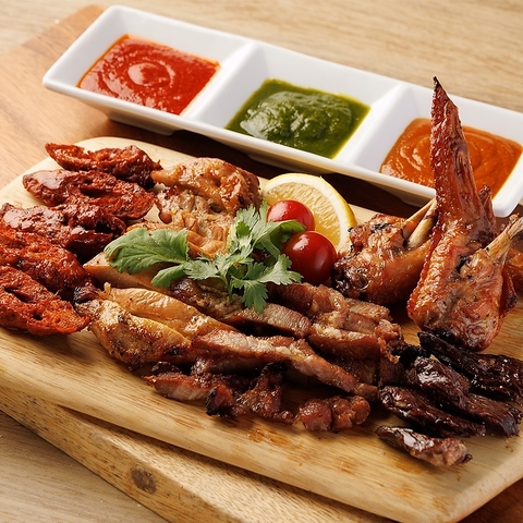 こだわりの自家製窯、タンドール釜で焼いたお肉は余分な脂が落ちてヘルシーなのにジューシーな食感をお楽しみ頂けます。『釜焼き豚』『釜焼きマトン』『釜焼きチキン』などなど♪秘伝のレシピとタンドール釜の相性は抜群!!他では絶対味わえないやみつき間違いなしのお肉料理です。画像は、人気メニュー肉盛り合わせ◎