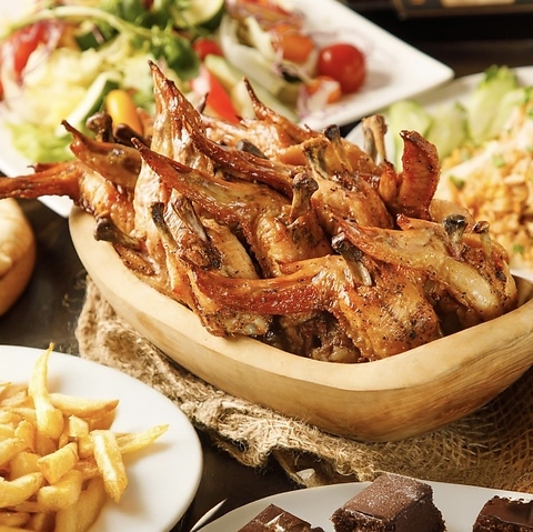 タンドールで焼き上げる、名物のアジアン窯焼き手羽先が食べ放題の飲み放題付コース。香ばしい焼き上がりで、ビールがススム絶品!その他にも、チーズナンや蒸し餃子モモ、選べる〆の一品等々大満足頂けるコースです!