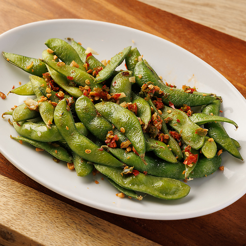 ビールやハイボール、ワインにも合う料理多数!こちらの写真はガーリック枝豆◎