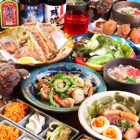 オリオン生ビール付きの飲み放題が楽しめるコースです。料理9品を堪能しながら、2時間の飲み放題がなんと5000円(税込)!ミミガーや人参シリシリー、ゴーヤーチャンプルー、ラフテーなど、沖縄の味覚をお楽しみいただけます。さらに、泡盛や古酒も飲み放題!沖縄の美味しさを心ゆくまでご堪能ください!