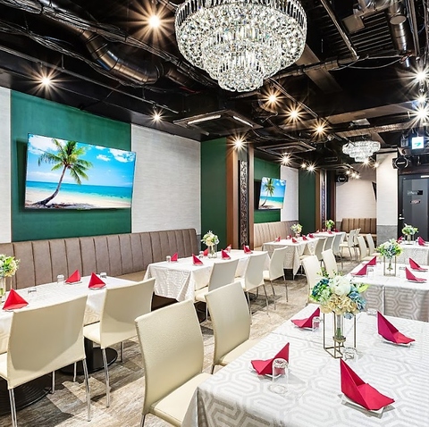 【1フロアまるごと貸切“バハマール”】20~50名様までご利用いただける貸切スペース。着席・半立食、大皿だし・ビュッフェスタイル等、幅広く対応可能です。