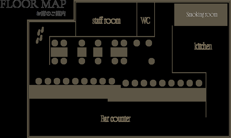 | 最大宴会収容人数 | 33人(カウンター18席、4名様用テーブル3卓、1名様用テーブル3席) |