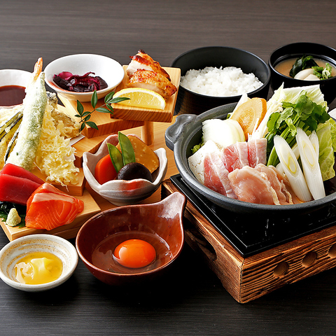 「軍鶏鍋」はお祝いのシーンにもぴったり!軍鶏ならではの豊かな旨味と、独特歯ごたえ!鮮度抜群!新鮮な軍鶏を使用した創作料理を是非ご堪能ください!<沖田総司 しゃもすき焼き大階段ご膳:2,308円(税込)>