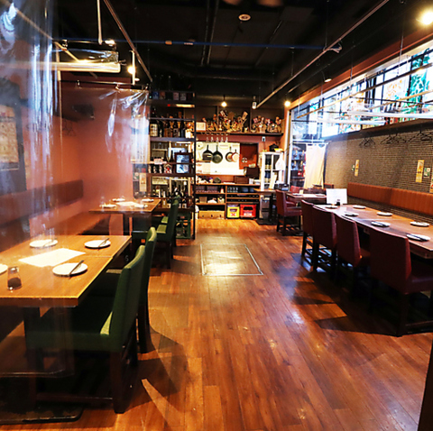 階段を下り、お店に入ると、和モダンの落ち着いた空間が広がります。半地下ですが、天井の高い窓ガラスがあるため、広々としていてゆったりお寛ぎいただけます。各種宴会もお気軽にご相談ください!